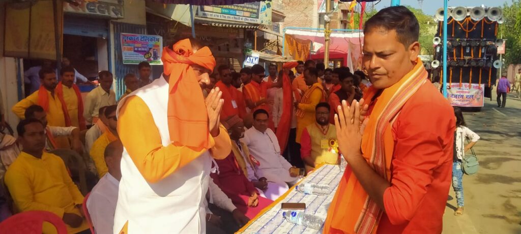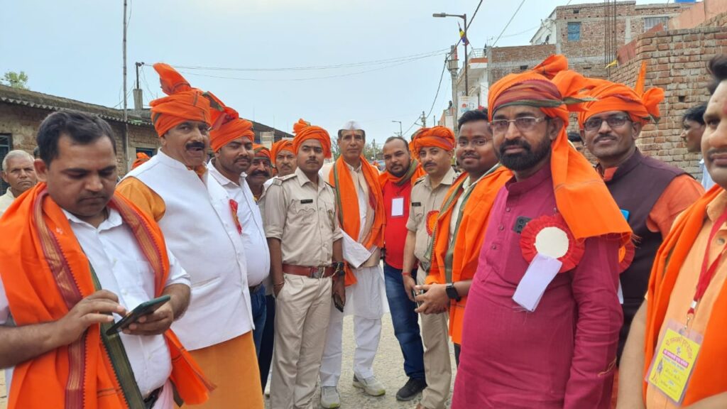 मंच पर बैठे हुए डीएसपी साहब प्रखंड विकास पदाधिकारी थाना पदाधिकारी इंस्पेक्टर साहब भाजपा जिला के उपाध्यक्ष रामचंद्र यादव जी विधायक प्रतिनिधि पंकज लाल राजन पांडे बिश्रामपुर नगर मंडल के मंडल अध्यक्ष बबनराम एवं सभी अतिथियों को कमेटी के लोगों ने भगवा पगड़ी बांधकर सम्मानित करने का काम किया