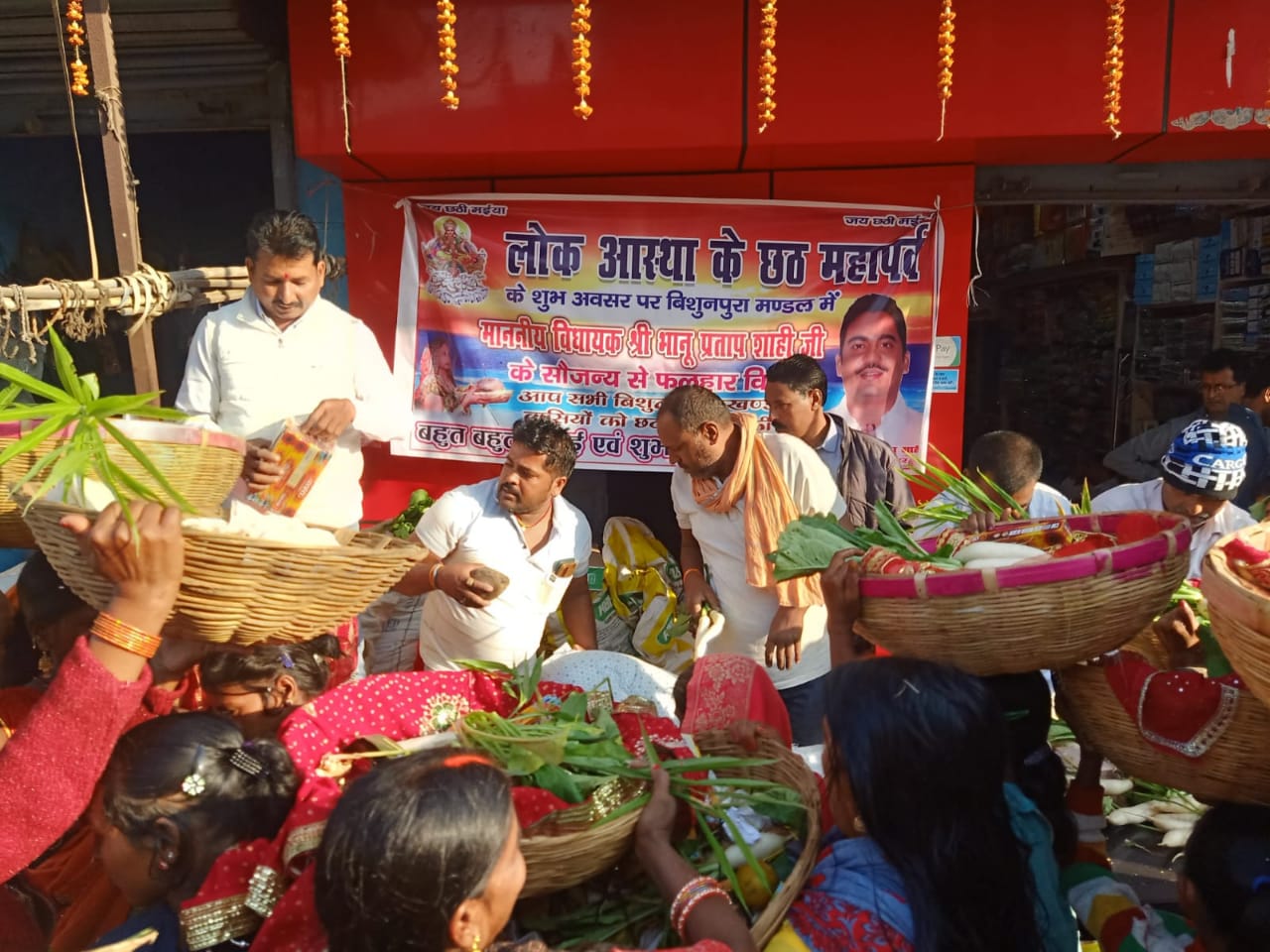 लोक आस्था के महापर्व छठ पूजा के अवसर पर रविवार को चार दिवसीय छठ पूजा के दूसरे दिन क्षेत्रीय विधायक भानु प्रताप शाही के निर्देश पर बिशुनपुरा शंकर मोड़ के पास छठ व्रतियों के बीच फलहार का वितरण किया गया।
