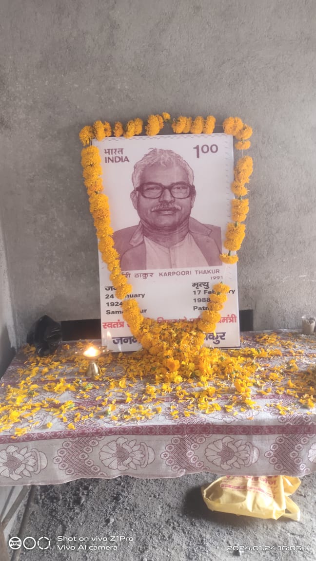 समाजसेवी आजाद चंद्रवंशी ने अपने संबोधन में कहा कि सरकार,जननायक कर्पूरी ठाकुर की जयंती 24 जनवरी को राष्ट्रीय अवकाश घोषित करे जो कि उनके लिए सच्ची श्रद्धांजलि होगी आगे कहा कि आज युवाओं को जननायक कर्पूरी ठाकुर के विचारों पर चलकर समाजहित में काम करने की जरूरत है। मौके पर मंच का संचालन करते हुए सत्यनारायण ठाकुर विभूति ने कहा कि कर्पूरी ठाकुर स्वतंत्रता सेनानी, शिक्षक, राजनीतिज्ञ तथा बिहार के मुख्यमंत्री रहे। लोकप्रियता के कारण उन्हें जननायक कहा जाता है। कर्पूरी ठाकुर का जन्म ब्रिटिश भारत में समस्तीपुर के एक गांव पितौंझिया में एक नाई परिवार में हुआ था, जिसे अब कर्पूरीग्राम कहा जाता है। भारत छोड़ो आन्दोलन के समय उन्होंने 26 महीने जेल में बिताए थे। वे सामाजिक रूप से पिछड़ी किन्तु सेवा भाव के महान लक्ष्य को चरितार्थ करती नाई जाति में जन्म लेने वाले इस महानायक ने राजनीति को भी जनसेवा की भावना से जिया। ऐसे महानायक को चरणों में कोटि-कोटि नमन। कार्यक्रम में अहम योगदान मनोज कुमार रवि जी का रहा जिन्होंने ऐसे महानायक के जयंती के अवसर पर फ्री में साउंड देकर एक कृतिमान स्थापित किया।
