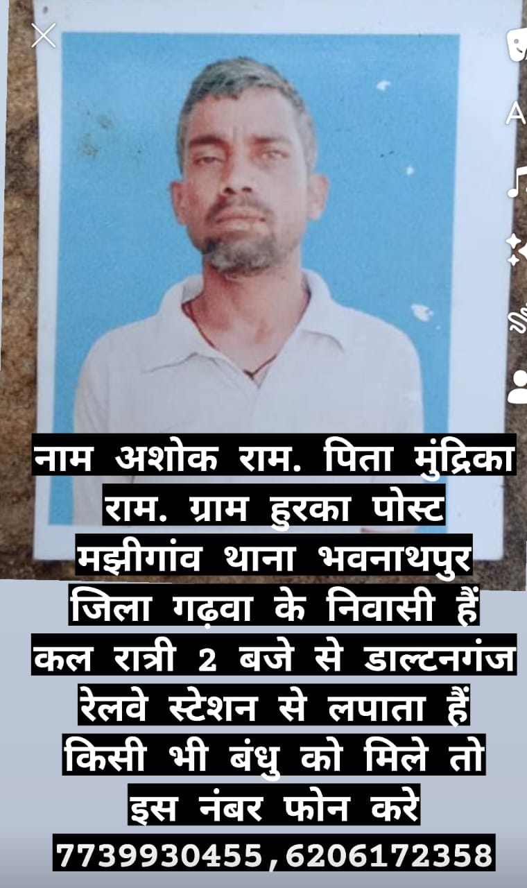 गढ़वा जिला के केतार प्रखंड अंतर्गत पंचायत लोहरगड़ा ग्राम हुरका निवासी पिता मुंद्रिका राम के 35 वर्षीय पुत्र अशोक राम दिन मंगलवार को अपने घर से बाहर काम करने निकला हुआ था मंगलवार को रात्रि में 10 बजे डाल्टनगंज रेलवे स्टेशन से ही लापता हैं उनका पूरा परिवार चिंतित हैं उनके परिजनों ने बताया कि उनकी दिमागी हालत ठीक नहीं है वे 5फीट 9इंच व सावला रंग के है अगर किसी भी सजन को दिखे तो 7739930455, 6206172358 पर कॉल कर सूचना अवश्य दें ।