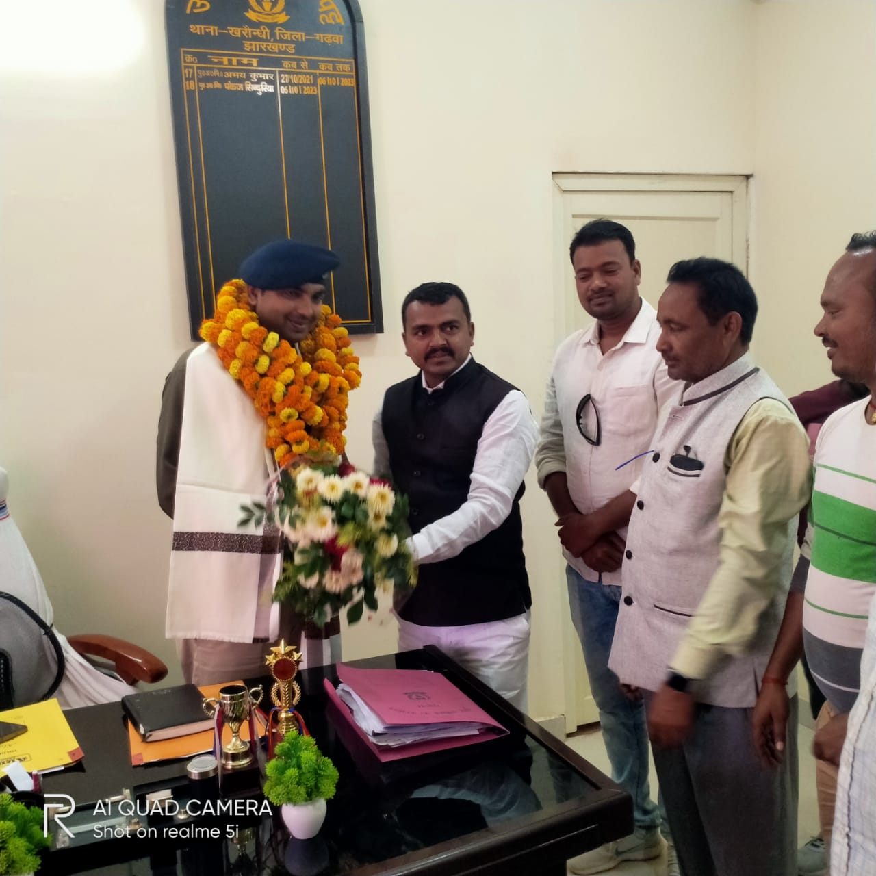 खरौंंधी (गढ़वा): बुधवार को आजसू पार्टी के जिला प्रवक्ता सह पूर्व उपप्रमुख गोरखनाथ चौधरी ने खरौंंधी थाना में नवपदस्थापित रवि कुमार केशरी को शांल ,बुके एवं मला पहनाकर स्वागत किया । चौधरी ने कहा की क्षेत्र के लोगों में उम्मीद है की हो रहे क्षेत्र में अबैध शराब बिक्री,अबैध जुआ, चोरी पर अंकुश लगेगा और हम लोग भय मुक्त रहेंगे। वहीं थाना प्रभारी रवि केशरी ने कहा की क्षेत्र के जो भी लोग समस्या लेकर थाना पहुंचेंगे उस समस्या को जल्द निदान किया जाएगा।हर मामले की जांच कर पुलिस कार्रवाई करती है और आगे भी करेगी।इस मौके पर विधायक प्रतिनिधि विनोद चौधरी, श्यामलाल चौधरी, दुग्धेश्वर प्रसाद यादव,चंदन कुमार वर्मा,देव कुमार चौधरी सहित अन्य लोग उपस्थित थे।
