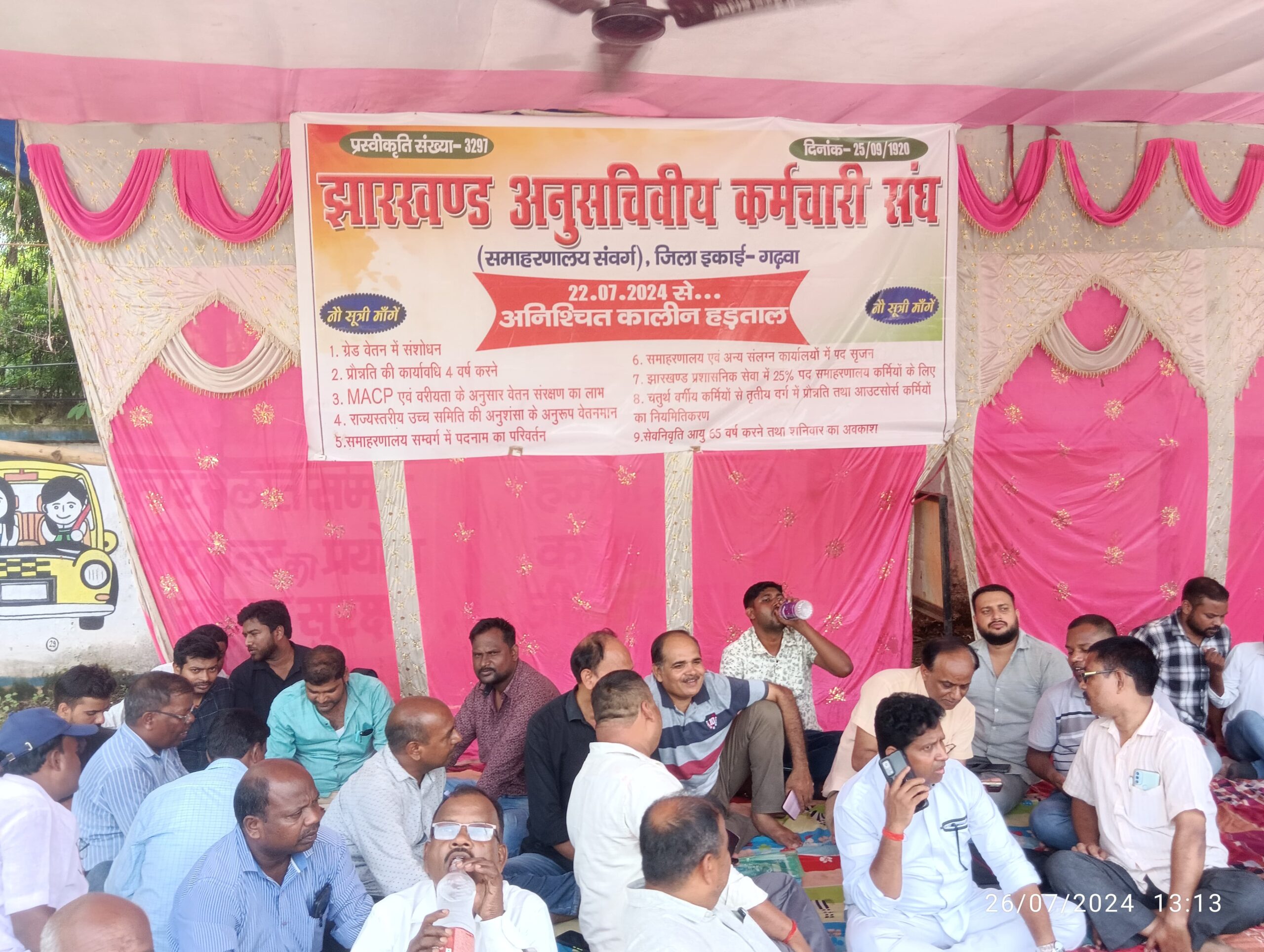 गढ़वा। समाहरणालय संवर्ग के कर्मियों ने अपनी नौ सुत्री मांगों के समर्थन में शुक्रवार को पांचवे दिन भी हड़ताल पर डटे रहे। समाहरणालय के समक्ष झारखंड अनुसचिवीय कर्मचारी संघ के बैनर तले जिला अध्यक्ष त्रिगुण स्वामी पांडे की अध्यक्षता में संघ के सदस्यों ने धरना दे, अपनी मांगों के समर्थन में जमकर नारेबाजी कर रहे हैं। व सरकार के स्तर से अब तक वार्ता के लिए कोई पहल नहीं की जा रही है। जब तक मांग पर सकारात्मक पहल और मांग पूरी नहीं होती है तब तक हम लोग हड़ताल पर रहेंगे। इधर कर्मियों के हड़ताल पर चले जाने से समाहरणालय से लेकर प्रखंड, अंचल कार्यालय में काम काज आम आवाम का ठप पर गया है। आम जनता प्रखंड, अंचल और समाहरणालय पहुंचकर कर्मियों के हड़ताल पर रहने से उन्हें निराश होकर लौटना पड़ रहा है। हड़ताल पर बैठे कर्मियों में प्रमोद कुमार, रघुवीर राम,आलोक कुमार, संजय कुमार, सुनीता पूर्ति, रेणु तिर्कि, प्रदेश महासचिव बिरेंद्र कुमार यादव, राज्यध्यक्ष राजेश रंजन दुबे सहित अन्य कर्मचारी धरना स्थल पर उपस्थित थे।