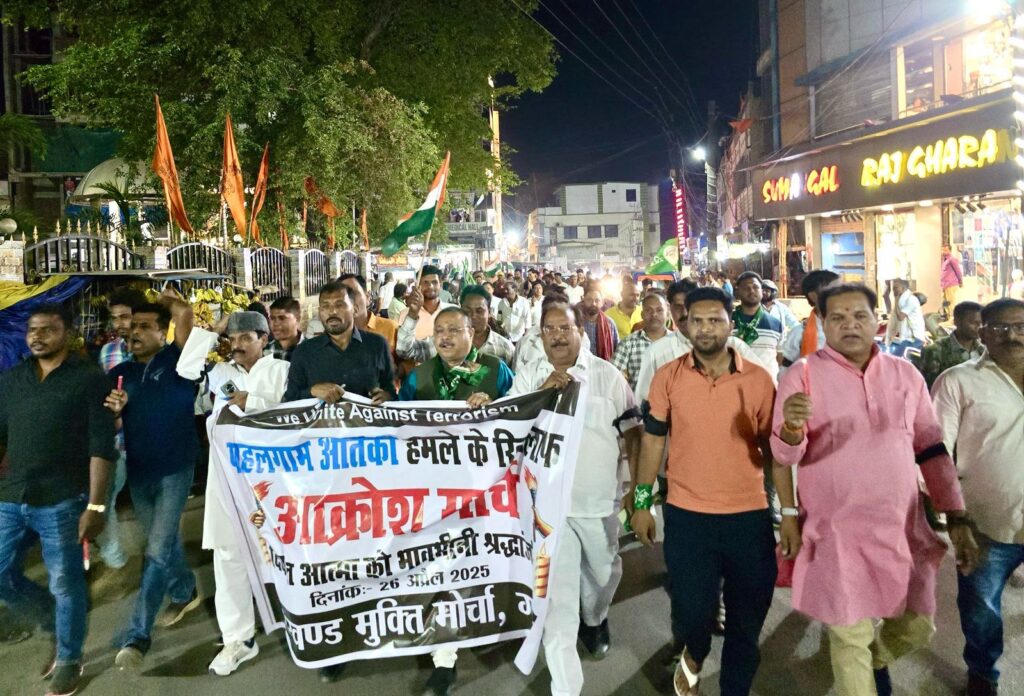 गढ़वा: झारखंड मुक्ति मोर्चा गढ़वा जिला इकाई ने पहलगाम (जम्मू-कश्मीर) में हुए आतंकी हमले के खिलाफ शनिवार को आक्रोश मार्च निकाला। इस दौरान झामुमो नेताओं और कार्यकर्ताओं ने हमले में मारे गए निर्दोष पर्यटकों की आत्मा की शांति के लिए मौन रखकर भावभीनी श्रद्धांजलि दी। मार्च के दौरान देश की एकता और अखंडता बनाए रखने तथा आतंकवाद के खिलाफ कड़े कदम उठाने की जोरदार मांग उठाई गई।