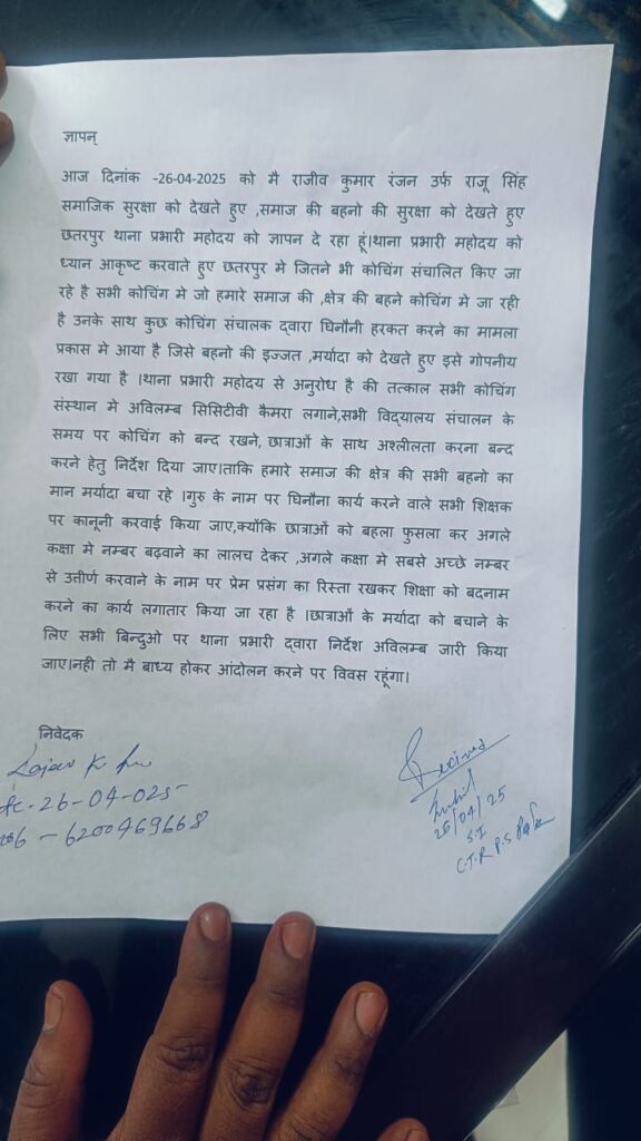 छतरपुर,पलामू। ज़िला के छतरपुर युवा नेता राजीव कुमार रंजन उर्फ़ राजू सिंह ने छतरपुर मे चल रहे कोचिंग संचालक के गंदे रवैया के विरोध मे छतरपुर थाना प्रभार प्रभारी सुशील उराव को ज्ञापन सौपा ।ज्ञापन मे मांग किया गया है की छतरपुर मे संचालित कोचिंग संस्थान के संचालको द्वारा छात्राओं को अगले कक्षा मे अच्छे नम्बर से उत्तीर्ण करवाने या मैट्रिक इंटर की परीक्षा मे गेस उपलब्ध करवाने का लालच देते है इसके बाद छात्राओं से प्रेम प्रसंग का रिस्ता बढ़ाते है और अश्लील हरकत करने मे बाज नही आते है ।ऐसी घटनाएं छतरपुर मे दर्जनों हुई है लेकिन कोचिंग संचालक द्वारा मामले को गुप्त रूप से भारी पैसा देकर के सबूत को खत्म करवा दिया जाता है जिससे कानून के नजर मे अच्छे दिखने का काम करते है।युवा नेता राजीव कुमार रंजन उर्फ़ राजू सिंह ने स्थानीय प्रशासन से आग्रह करते हुए निम्न बिन्दुओ पर निर्देश देने का आग्रह् किया। छतरपुर के सभी कोचिंग संचालक मे सिसिटीवी लगवाया जाए।विद्यालय के समय मे कोचिंग का संचालन नही किया जाए।कोचिंग का संचालन शाम मे न हो ।थाना प्रभारी सह प्रभार प्रभारी सुशील कुमार उराव ने अस्वस्त किए और उन्होंने कहा की हमारे समाज की बहन बेटियों के इज्जत के साथ कोई खेलने का प्रयास किया तो वह सलाखों के पीछे रहेगा ।समाज के सभी बहन बेटियों का इज्जत का ख्याल रखना हमारी जिमेवारी ही नही बल्की जवाबदेही भी है।