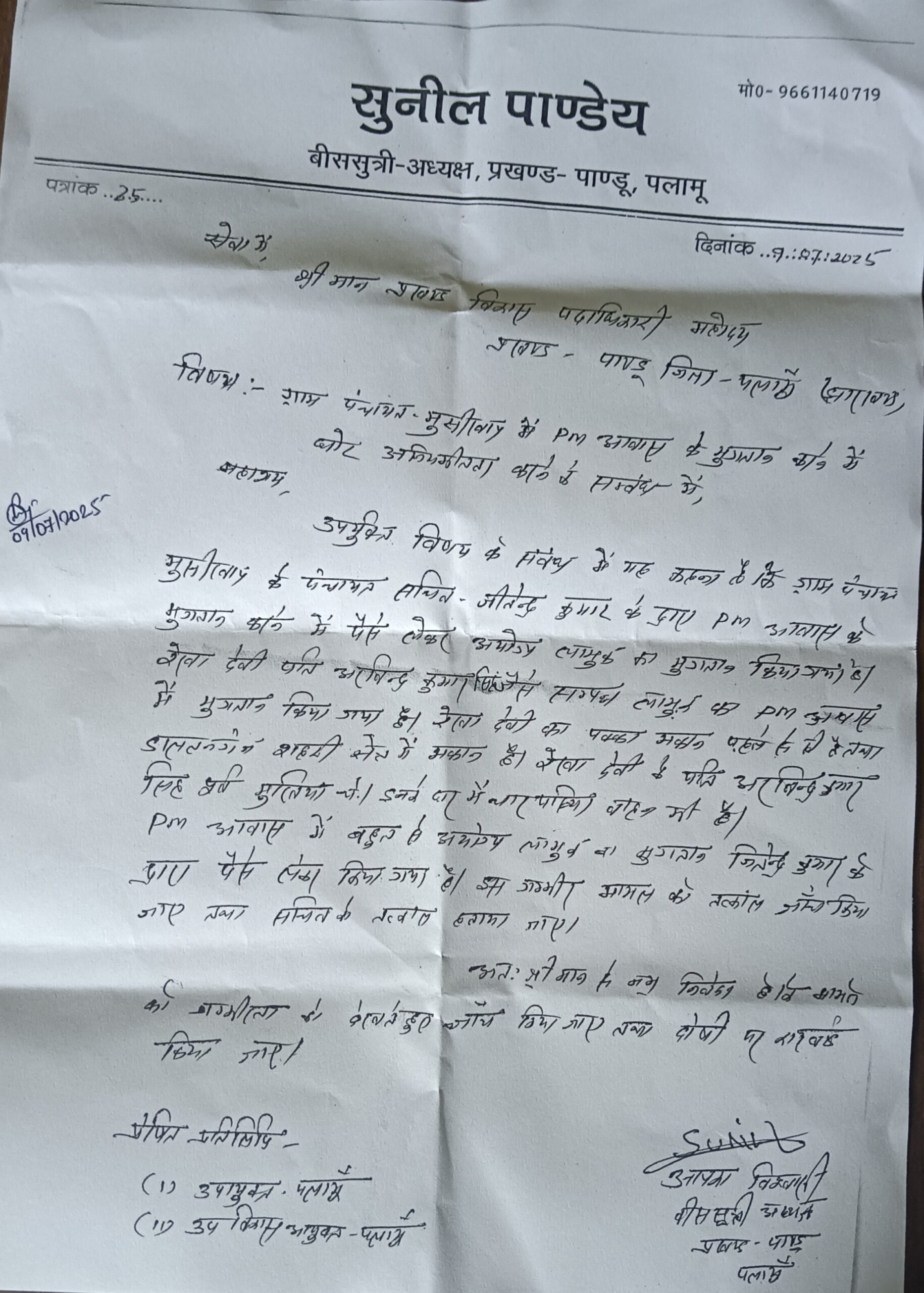 श्री पांडेय ने इस मामले को लेकर प्रखंड विकास पदाधिकारी को आवेदन सौंपते हुए जांच की मांग की है। उनका आरोप है कि पंचायत सचिव की मिलीभगत से इस प्रकार की अनियमितता हुई है और पैसे लेकर आवास आवंटित किए गए हैं।