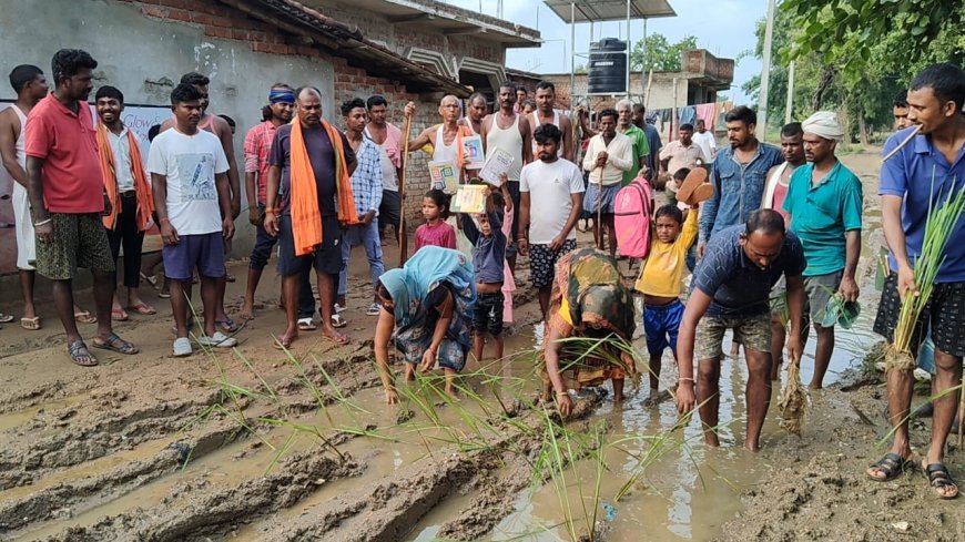 डंडई: प्रखंड के जरही गांव के अयोध्या बांध मुख्य सड़क से कदैलिया गांव तक करीब तीन किलोमीटर की दूरी में सड़क कीचड़ व दलदल में तब्दील हो गई है। जिससे इन दिनों ग्रामीण व राहगीरों को सड़क से पैदल गुजरना मुश्किल हो गया है। सड़क की इस समस्या को लेकर ग्रामीणों ने शनिवार को अनोखे अंदाज़ में विरोध प्रदर्शन करते हुए सड़क पर धान की रोपनी किया। इस दौरान विरोध प्रदर्शन कर रहे लोगों ने जमकर नारेबाज़ी भी किया।