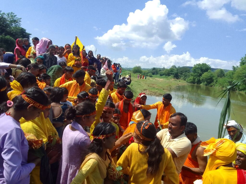 कलश यात्रा की शुरुआत मंत्रोच्चारण और वैदिक रीति-रिवाजों के साथ हुई। हाथों में कलश और सिर पर चुनरी लिए महिलाएं एवं युवक-युवतियां भक्ति गीत गाते हुए आगे बढ़ रहे थे। पूरे गांव का माहौल भक्तिमय हो गया और दुर्गा माता के जयकारों से वातावरण गुंजायमान रहा।