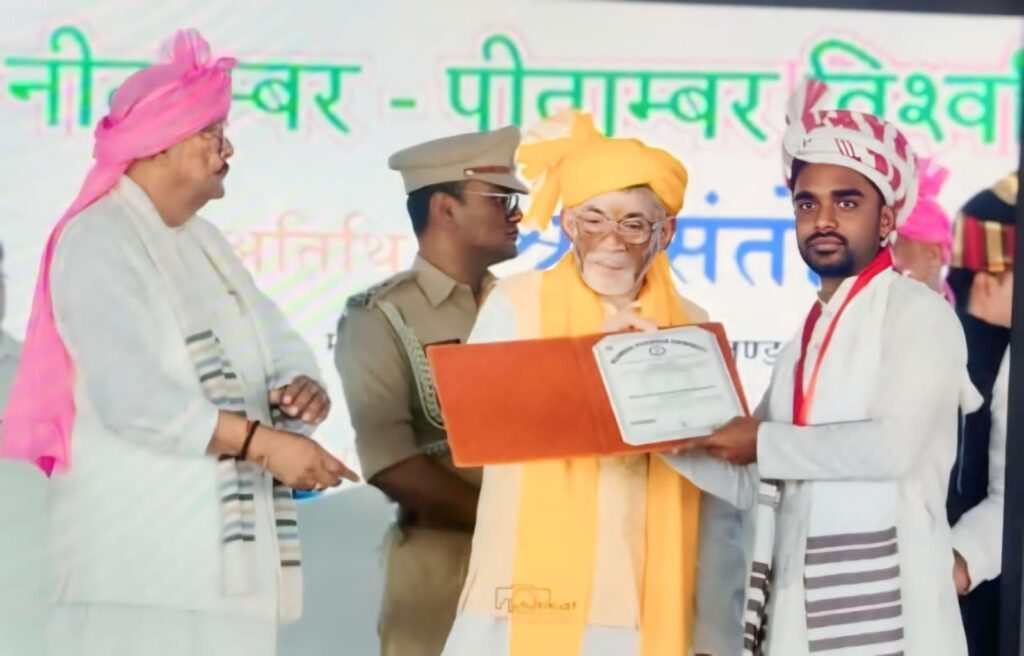 रमना । नीलांबर-पीतांबर विश्वविद्यालय, मेदिनीनगर में आयोजित तृतीय दीक्षांत समारोह में रमना बाजार निवासी स्वर्गीय दिलीप प्रसाद गुप्ता के पुत्र मनीष कुमार गुप्ता को राज्यपाल सह कुलाधिपति संतोष गंगवार ने गोल्ड मेडल और प्रशस्ति पत्र देकर सम्मानित किया। मनीष ने विश्वविद्यालय के रसायन शास्त्र (पोस्ट ग्रेजुएट) विभाग सत्र 2020-22 में 73 प्रतिशत अंक प्राप्त कर पूरे विश्वविद्यालय में प्रथम स्थान हासिल किया है।