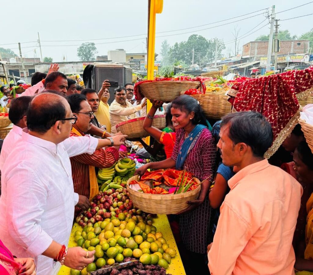 गढ़वा। आस्था और समर्पण का महापर्व छठ के द्वितीय अनुष्ठान खरना के मौके पर रविवार को मेराल के डंडई रोड में झारखंड सरकार के पूर्व मंत्री झामुमो के केंद्रीय महासचिव मिथिलेश कुमार ठाकुर ने छठ व्रतियों के बीच फल एवं छठ पूजा सामग्री का वितरण किया। हजारों की संख्या में श्रद्धालुओं ने लाभ उठाया। इस दौरान श्री ठाकुर ने छठ व्रतियों के बीच 40 पेटी सेव, 20 बोरा संतरा, दो क्विंटल सिंघाड़ा, एक क्विंटल मूंगफली, 35 क्विंटल हल्दी, अदरक, मूली, गाजर आदि सहित नारियल, अगरबत्ती एवं अन्य पूजन सामग्री का वितरण किया।