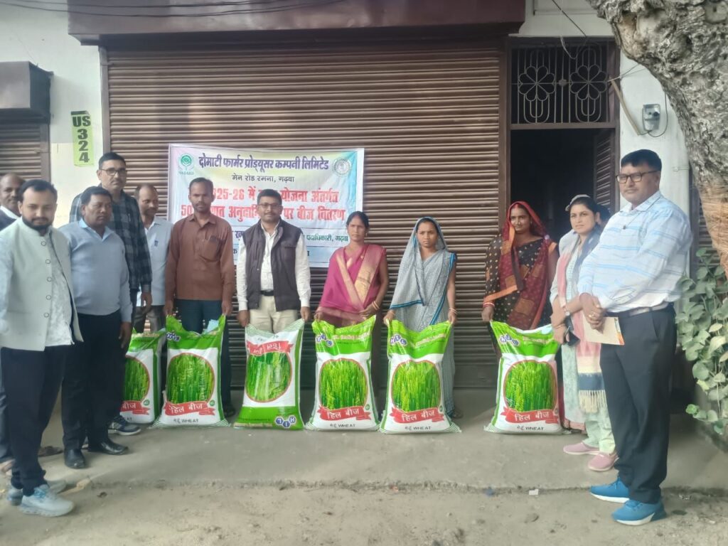 रमना ।  दोमाटी फार्मर प्रोड्यूसर कंपनी के परिसर में शनिवार को विभिन्न पंचायतों से पहुंचे 10 किसानों के बीच चार क्विंटल गेहूं बीज का वितरण किया गया। कार्यक्रम में जिला कृषि पदाधिकारी खुशबू कुमारी ने किसानों के बीच बीज वितरण करते हुए कहा कि जिले के सभी प्रखंडों में किसानों द्वारा गठित उत्पादक समूह (एफपीओ) सक्रिय रूप से संचालित किए जा रहे हैं।