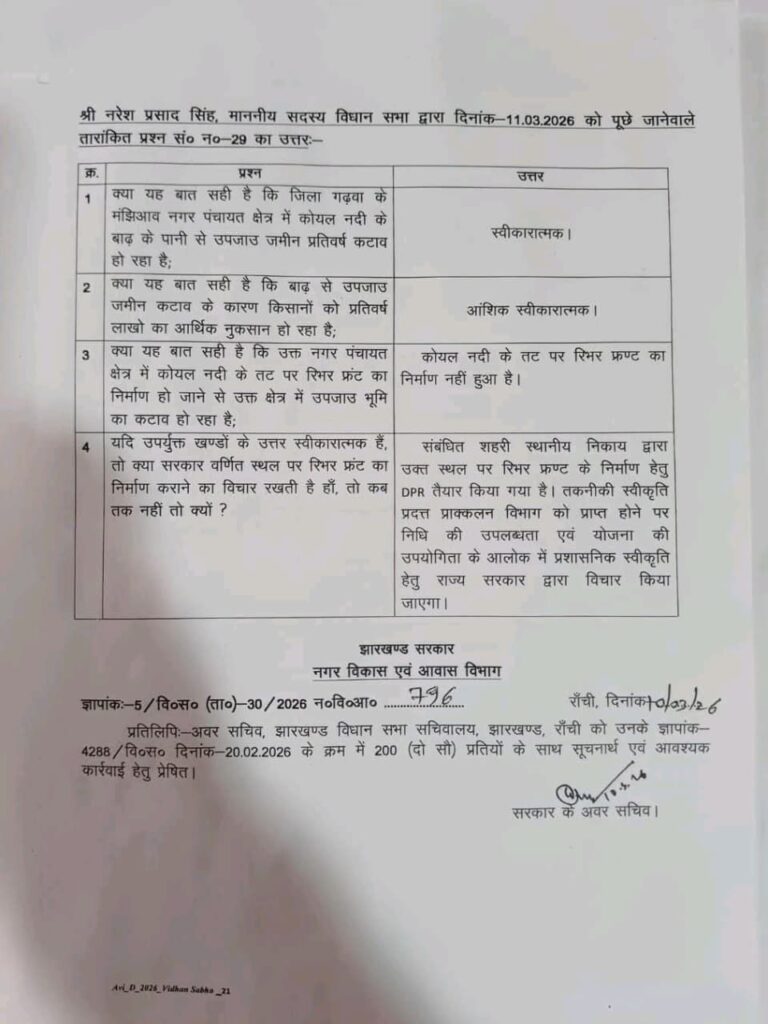 झारखंड विधानसभा में 11 मार्च 2026 को गढ़वा जिले के मझिआंव नगर पंचायत क्षेत्र से जुड़ा एक महत्वपूर्ण मुद्दा उठाया गया। माननीय विधायक श्री नरेश प्रसाद सिंह द्वारा पूछे गए तारांकित प्रश्न के जवाब में सरकार ने स्वीकार किया कि मझिआंव नगर पंचायत क्षेत्र में बहने वाली कोयल नदी की बाढ़ के कारण उपजाऊ जमीन का लगातार कटाव हो रहा है।