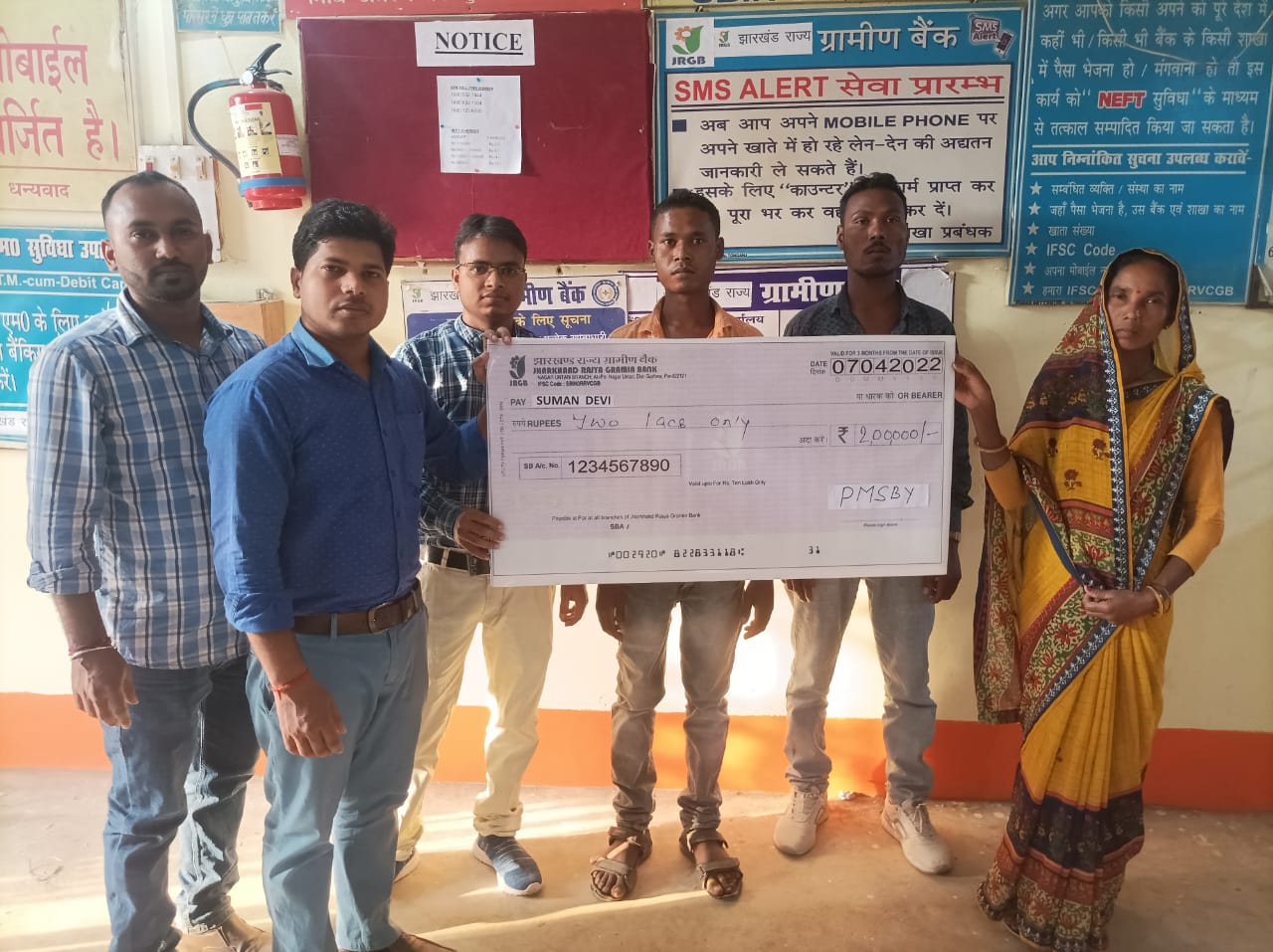बंशीधर नगर झारखंड राज्य ग्रामीण बैंक शाखा श्री बंशीधर नगर के खाताधारक स्व उपेंद्र उरांव की विधवा सुमन देवी के बैंक खाते में बुधवार को शाखा प्रबंधक वेद प्रकाश ने प्रधानमंत्री सुरक्षा बीमा योजना के तहत दो लाख रुपये ट्रांसफर किया। साथ ही चेक का प्रतीक चिन्ह सौंपा। इसकी जानकारी देते हुए शाखा प्रबंधक वेद प्रकाश ने बताया कि उपेंद्र उरांव का निधन सड़क दुर्घटना में हो गयी। मौत से पहले उपेंद्र ने 12 रुपये का प्रधानमंत्री सुरक्षा बीमा योजना का पॉलिसी खरीदा था। इंश्योरेंस कंपनी के द्वारा सुमन देवी के नाम दो लाख रुपये का चेक दिया गया है। खाते में 200000 रुपये आने के बाद सुमन देवी ने प्रधानमंत्री नरेंद्र मोदी, झारखंड राज्य ग्रामीण बैंक व इंश्योरेंस कंपनी के प्रति आभार व्यक्त करते हुए कहा कि इस विकट परिस्थिति में मुझे दो लाख रुपये मिलेगा उम्मीद नहीं थी। मेरे पास एक रुपये भी नहीं था। इस परिस्थिति में मुझे 200000 रुपये का सहयोग मिला है। इससे अपने बच्चों को पढ़ा लिखा कर उनका भविष्य सवारूंगी। शाखा प्रबंधक वेद प्रकाश ने कहा कि बारह रुपये जो एक बहुत ही छोटी रकम है, इससे कोई भी खाताधारक प्रधानमंत्री सुरक्षा बीमा योजना की पॉलिसी खरीद सकता है। जो उसके व उसके परिवार की सुरक्षा के दृष्टिकोण से अति उत्तम है। सभी खाताधारक से आग्रह करते हैं कि कम से कम 12 रुपये की पॉलिसी अवश्य खरीदें।
