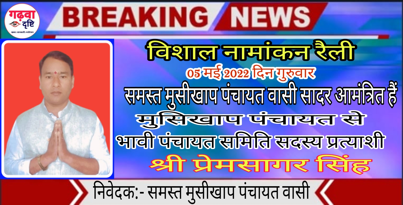 झारखंड: पलामू जिले के पांडू प्रखंड अन्तर्गत मुसीखाप पंचायत से भावी सुयोग, शिक्षित ,भावी पंचायत समिति सदस्य प्रत्याशी 05 मई 2022 दिन गुरुवार को नामांकन दाखिल करेंगे। विदित हो कि प्रेमसागर सिंह पांडू भाजपा मंडल अध्यक्ष हैं। सरल स्वभाव नेक विचार अच्छे व्यक्तित्व के धनी श्री सिंह ने विगत कई वर्षों से अपने पंचायत के साथ साथ प्रखंड क्षेत्र में हर जरूरतमंदो तक सरकारी योजनाओं का लाभ दिलाने का कार्य करते आ रहे हैं।श्री सिंह ने कहा कि अपने पंचायत के चौमुखी विकाश के लिए पंचायत समिति सदस्य पद के लिए अपना कदम बढ़ाया हूं।समस्त मुसीखाप पंचायत वासियों से आग्रह है कि हमारे नामांकन रैली में अधिक से अधिक संख्या में शामिल होकर अपना आशीर्वाद प्रदान एवं नामांकन रैली को सफल बनाने की कृपा करें। नामांकन रैली में समस्त मुसीखाप पंचायत वासी सादर आमंत्रित हैं।