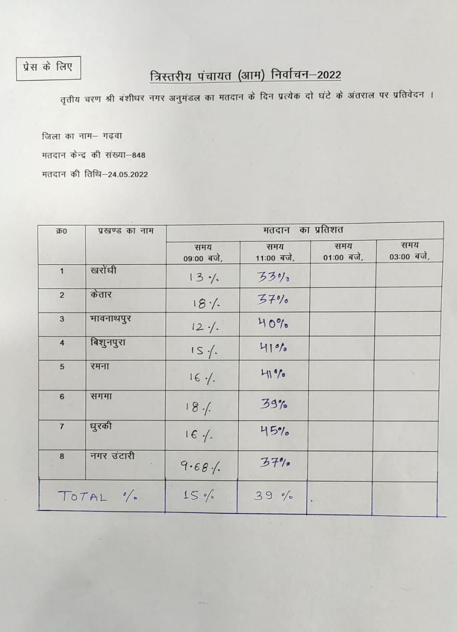 त्रि-स्तरीय पंचायत (आम) निर्वाचन 2022 के निमित्त गढ़वा जिला के श्री बंशीधर नगर अनुमंडल के सभी आठ प्रखंडों खरौंधी, केतार, भवनाथपुर, विशुनपुरा रमना, सगमा, धुरकी एवं नगर उंटारी में तृतीय चरण अंतर्गत हो रहे मतदान प्रतिशत प्रतिवेदन पूर्वाह् 11 बजे तक निम्नवत है:-।प्रखंड खरौंधी- 33%