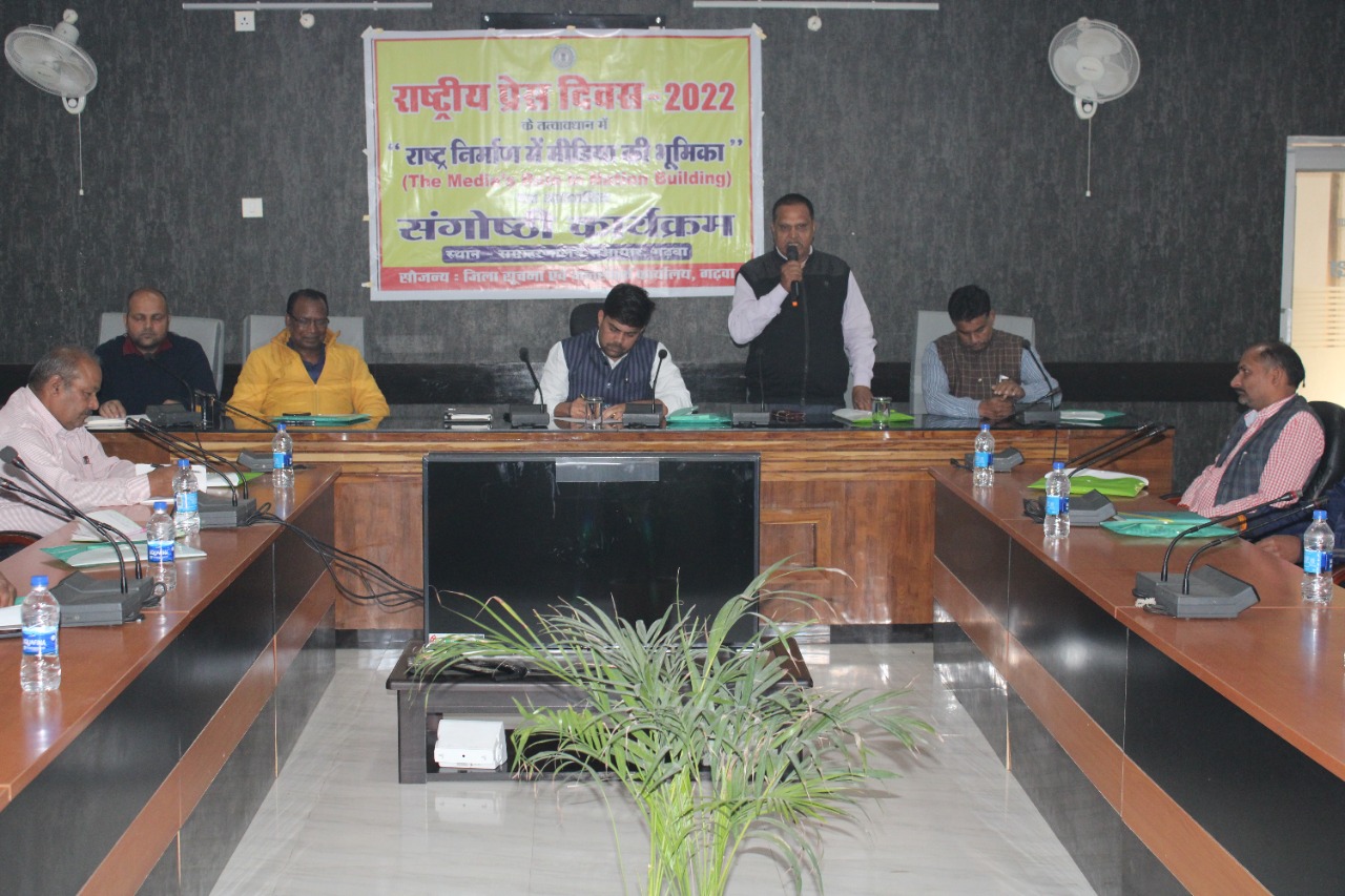 राष्ट्रीय प्रेस दिवस 2022 के मौके पर जिला जनसंपर्क विभाग की ओर से गुरूवार को समाहरणालय के सभाकक्ष में राष्ट्र निर्माण में मीडिया की भूमिका विषय पर संगोष्ठी का आयोजन किया गया। कार्यक्रम का उद्घाटन उपायुक्त रमेश घोलप एवं पत्रकारों ने संयुक्त रूप से भगवान नारद मुनि की तस्वीर पर माल्यार्पण कर एवं दीप जलाकर किया। मौके पर उपायुक्त रमेश घोलप ने कहा कि लोकतंत्र के चौथे स्तंभ मीडिया की राष्ट्र निर्माण से लेकर लोगों के व्यक्तिगत जीवन निर्माण में भी अहम भूमिका है। यदि किसी के सकारात्मक कार्य अथवा प्रयासों को मीडिया के माध्यम से पूरे समाज को जानकारी दी जाती है तो और बेहतर कार्य करने के लिए लोगों का मनोबल बढ़ता है तथा वे और भी बेहतर काम कर पाते हैं। साथ ही समाज के अंतिम लोगों की समस्या को मीडिया में उजागर होने के बाद वैसी समस्याओं को दूर किया जाता है तथा वैसे लोगों के लिए सरकार भी योजनाएं बनाकर लागू करती है। उपायुक्त ने कहा कि पत्रकारिता समाज का आइना है। मीडिया के माध्यम से उजागर किये गये मुद्दे पर प्रशासन एवं सरकार भी कार्रवाई करती है। सरकार द्वारा चलायी जा रही योजनाओं का प्रचार-प्रसार एवं लोगों को अपने हक, अधिकार के लिए जागरूक करने का काम भी मीडिया ही करती है। उन्होने कहा कि समाज को मीडिया पर अधिक भरोसा है इसलिए मीडिया की गुणवता एवं विश्वसनीयता बनाये रखना बेहद जरूरी है। गढ़वा जिला पत्रकार संघ के अध्यक्ष धनंजय सिंह ने कहा कि पत्रकार की भुमिका ऐसी होनी चाहिए कि किसी की जिंदगी बदल दे। जैसे नारद मुनि ने रत्नाकर की जिंदगी बदल दी थी। उन्होने कहा कि लोकतंत्र में पत्रकारिता को चौथा स्तंभ माना जाता है। यह चौथा स्तंभ सरकार ने नहीं बल्कि समाज ने बनाया है। पत्रकारों के उपर समाज की बहुत ही बड़ी जिम्मेवारी है। सच्चाई को कभी छुपने नहीं दें। अच्छे कार्यों को हमेशा बढ़ावा देना चाहिए। उन्होंने कहा कि राष्ट्र के निर्माण में मीडिया की बहुत बड़ी भूमिका है। प्रेस क्लब के अध्यक्ष विवेकानंद उपाध्याय ने कहा कि मीडिया को लोकतंत्र में चौथा स्तंभ माना जाता है। किसी भी राष्ट्र एवं समाज की उन्नति के लिए मीडिया की भूमिका महत्वपूर्ण है। आज के समय में मीडिया का काफी विकास हुआ है। प्रिंट मीडिया, इलेक्ट्रॉनिक मीडिया और अब सोशल मीडिया का भी प्रचलन बढ़ गया है। परंतु मीडिया के कार्यों में भी कुछ गिरावट आयी है। कभी-कभी लोग सबसे पहले की होड़ में खबरों की सत्यता की परख नहीं कर पाते हैं। गढ़वा जिला पत्रकार संघ के महासचिव धीरेंद्र चौबे ने कहा कि आज के समय में तमाम आरोपों के बाद भी पत्रकारिता मिशन है। कभी भी कोई पत्रकार राष्ट्र विरोधी खबर प्रकाशित नहीं करता। पत्रकार विनय पांडेय ने गजल के माध्यम से पत्रकारिता की स्थि